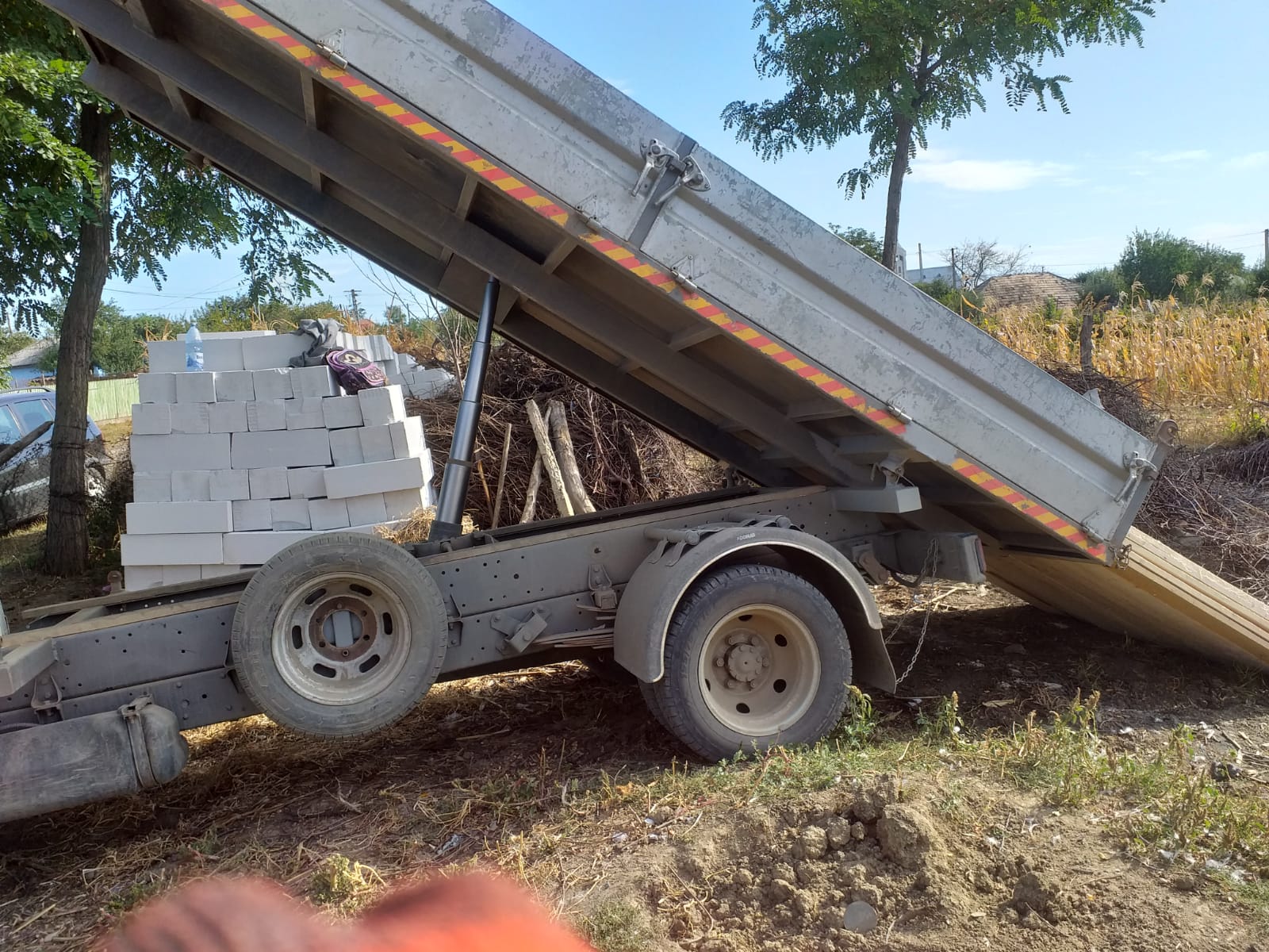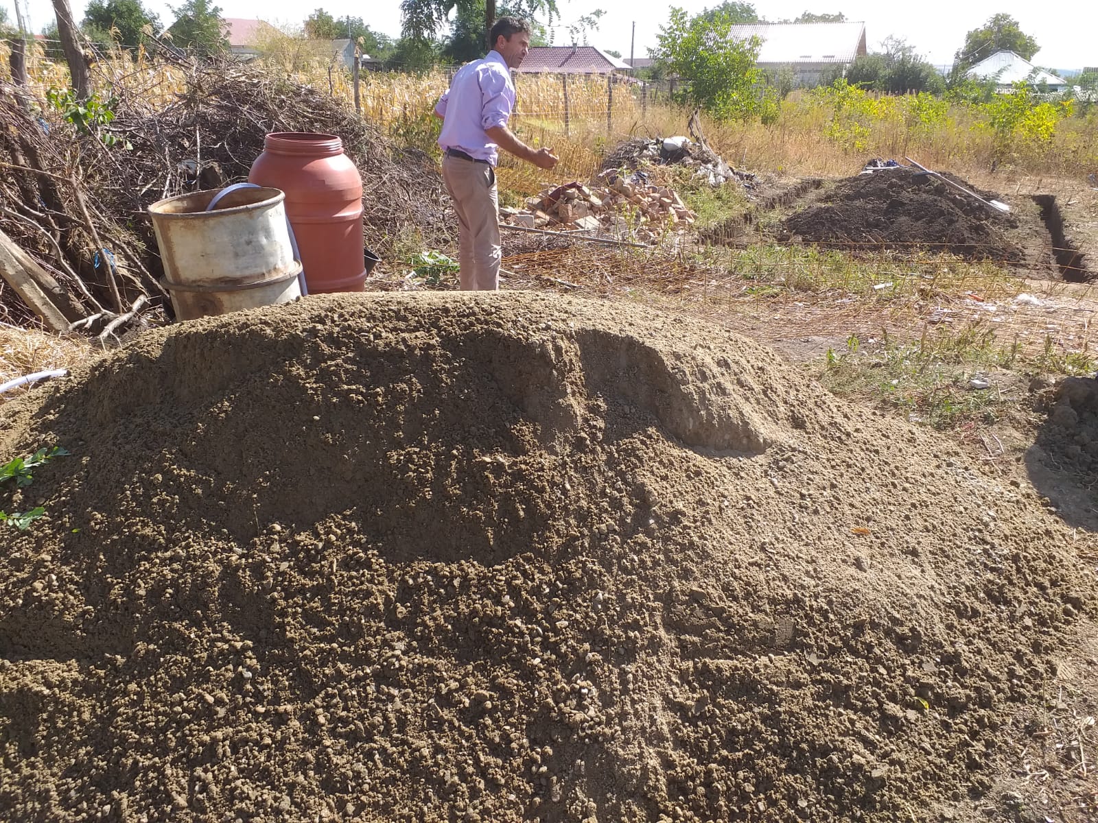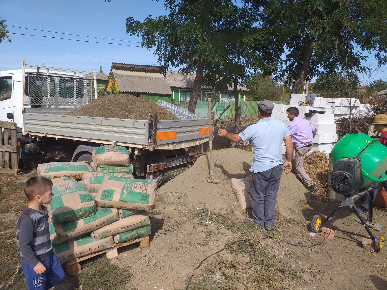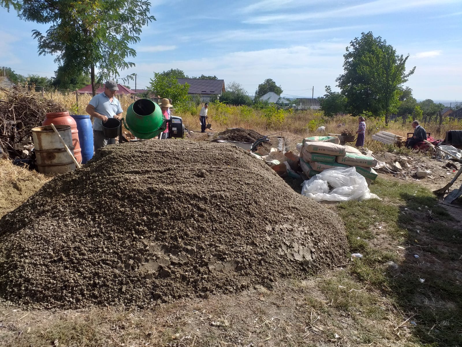 Se lucrează destul de anevoios, toată munca se face manual. Uşor ar fi să se comande o cifă sau mai multe cu beton, însă încercăm şi trebuie să ne încadrăm în posibilităţile financiare de care dispunem. Tot astăzi s-a livrat şi materialul lemnos necesar acoperişului.