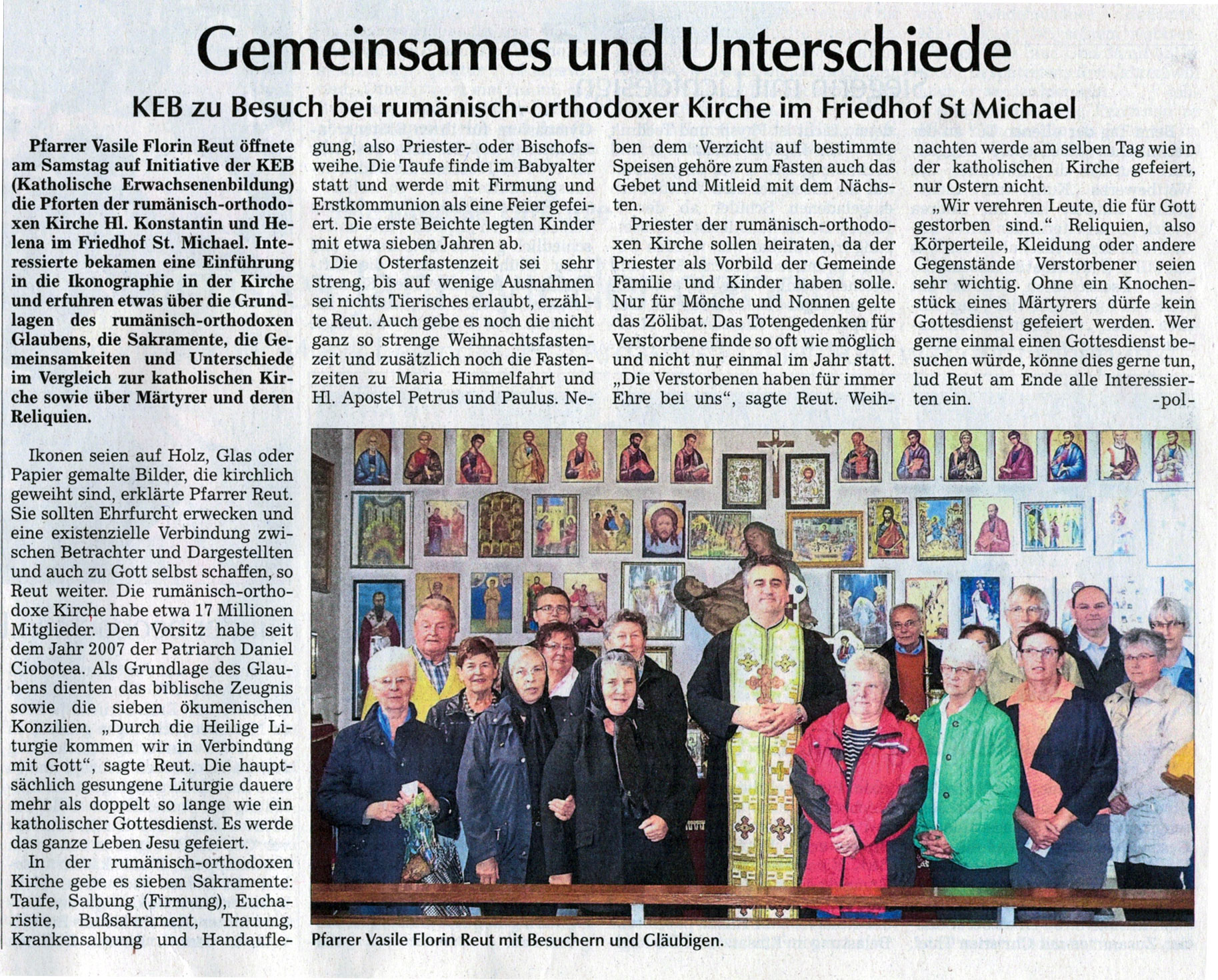 Quelle Zeitungsausdruck: Straubinger Tagblatt – Gemeinsames und Unterschiede: Vorstellung der rumänisch orthodoxen Kirche an die Katholische Erwachsenenbildung Straubing-Bogen